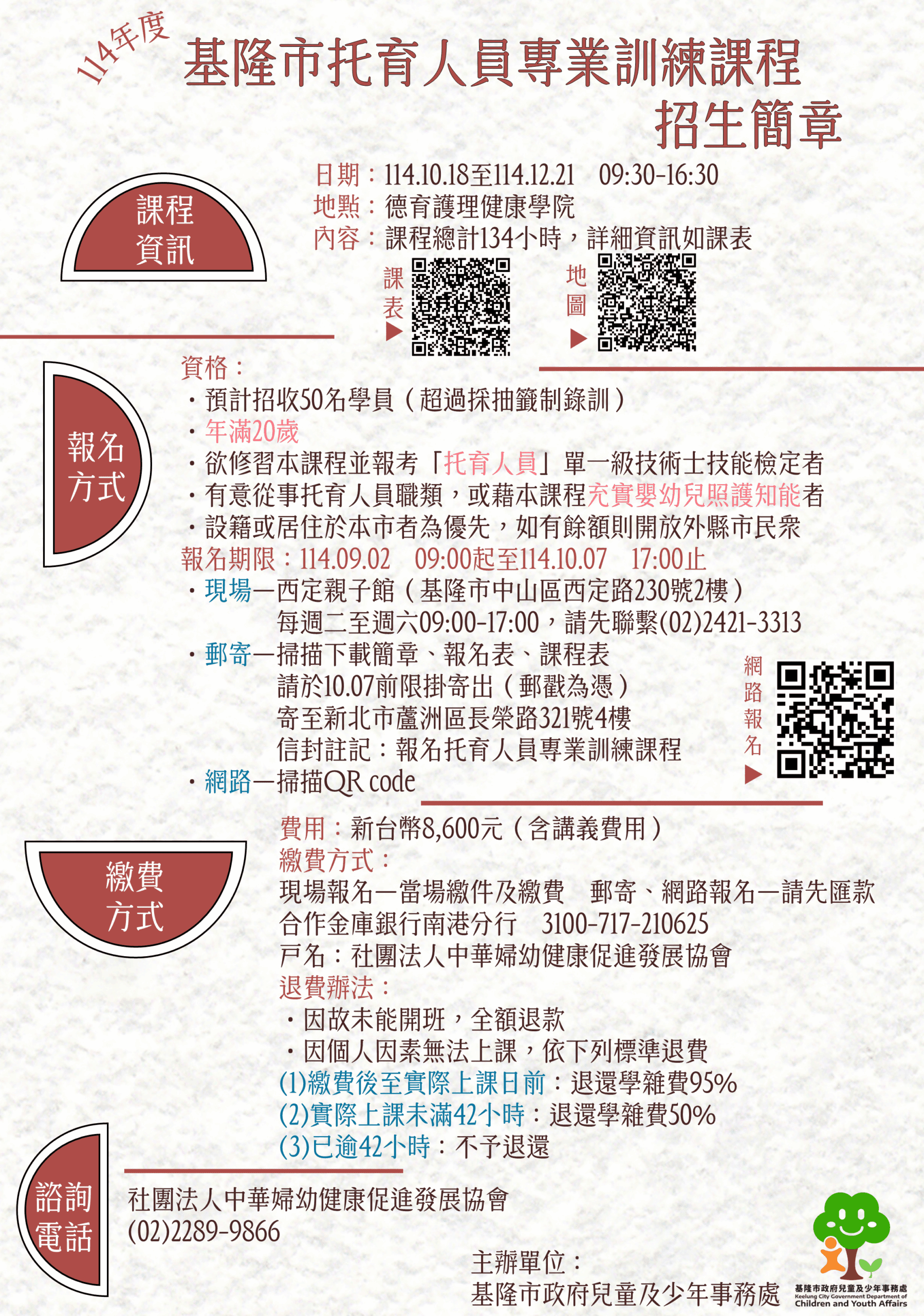 為提升基隆市托育服務品質,培養更多具備專業知能與實務能力的托育人員,市府兒童及少年事務處將於114年10月18日至12月21日,在德育護理健康學院辦理「托育人員訓練課程」。報名時間自9月2日起至10月7日止,民眾可選擇現場、郵寄或網路方式報名(報名連結:http://reurl.cc/9nDeR8),歡迎踴躍參加。