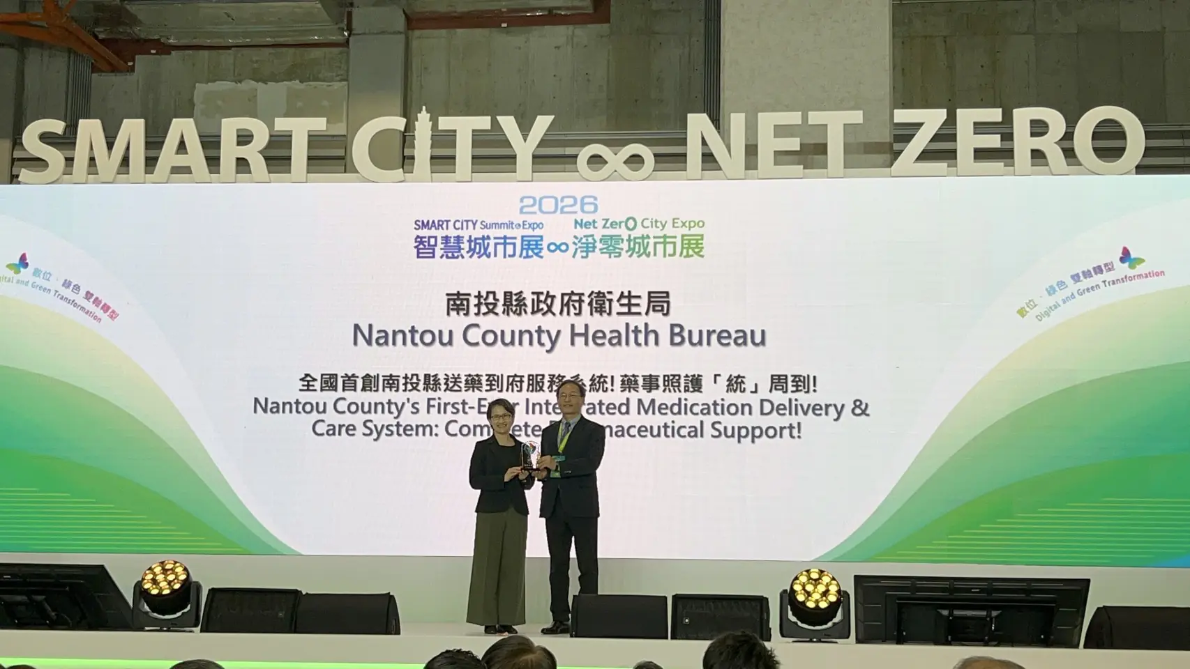 由衛生局攜手計畫處推動的「全國首創!南投縣送藥到府服務系統—藥事照護統周到」,榮獲由台北市電腦公會主辦之 「2026智慧城市創新應用獎-縣市創新應用組-智慧醫療優勝獎」,3月17日在台北南港展覽館隆重舉行頒獎典禮,由副總統蕭美琴親自頒獎表揚,肯定南投以智慧科技結合藥事專業,突破地理限制,打造偏鄉醫療照護創新典範的卓越成果。