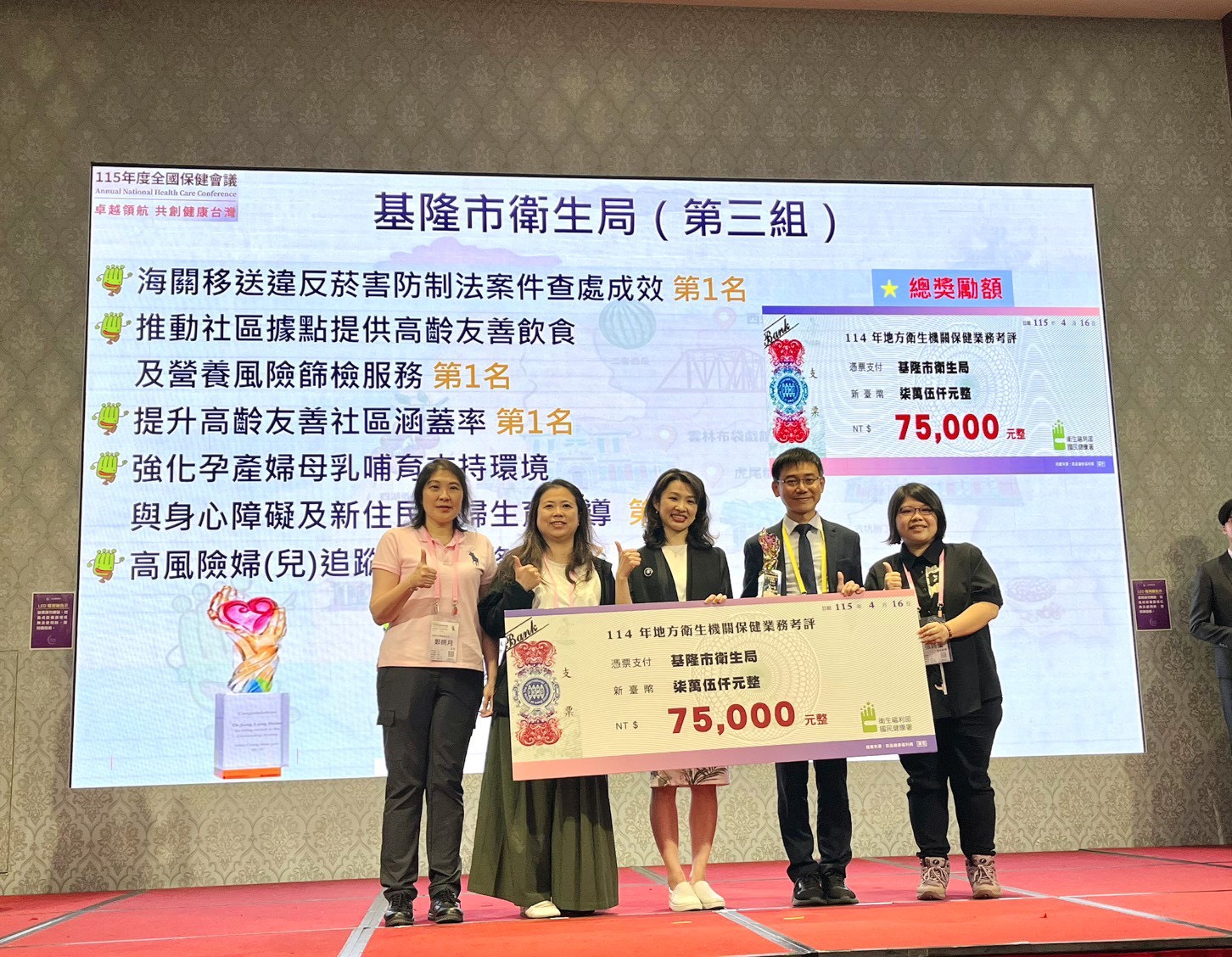 衛生福利部國民健康署昨(16)日於雲林縣舉辦全國保健會議,由署長沈靜芬親自頒發「114年地方政府衛生局辦理保健業務考評績優」獎項。基隆市衛生局在全國各縣市激烈競爭中表現亮眼,榮獲「第三組優等獎」、「海關移送違反菸害防制法案件查處成效第一名」、「推動社區據點提供高齡友善飲食及營養風險篩檢服務第一名」、「提升高齡友善社區涵蓋率第一名」、「強化孕產婦母乳哺育支持環境與身心障礙及新住民孕婦生育指導第一名」、「高風險婦 (兒 ) 追蹤關懷服務第二名」、「基隆市安樂區衛生所金所獎佳作」及「衛生局特別獎」等多項殊榮,充分展現本市在健康促進與預防醫學推動上的卓越成果與整體執行力。衛生局長張賢政親自出席領獎,並代表團隊感謝第一線護人員、醫療院所及社區夥伴長期以來的投入與支持,共同守護市民健康。