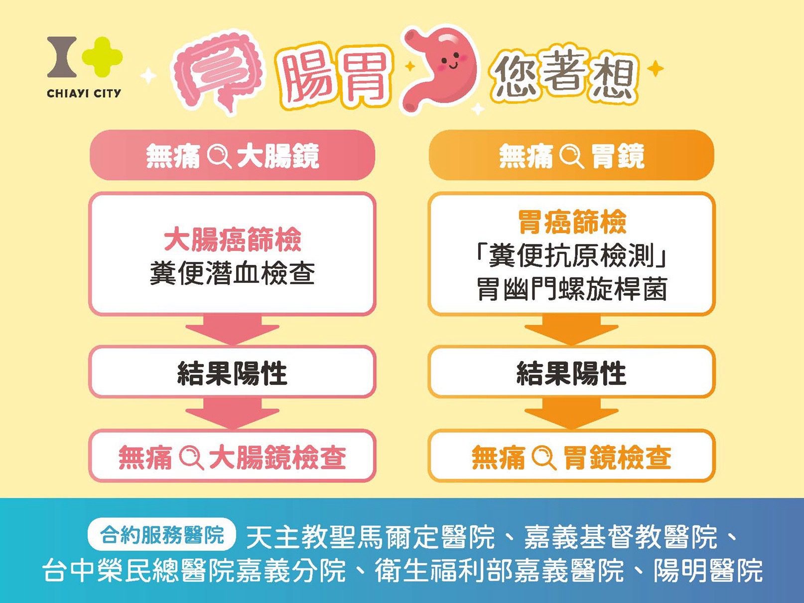 衛生局提醒,符合資格市民可持身分證及健保卡,至嘉義市合約醫院預約篩檢服務,衛生局並建議市民多加利用網路預約系統(https://imsr.cichb.gov.tw/),於篩檢前48小時完成預約,以縮短現場等候時間。此外,符合無痛腸胃鏡檢資格的市民,可至嘉義市合約醫院預約,包括嘉義基督教醫院、聖馬爾定醫院、臺中榮民總醫院嘉義分院、衛生福利部嘉義醫院及陽明醫院;就診時請攜帶身分證、健保卡及檢查報告單,以利資格確認與後續安排。