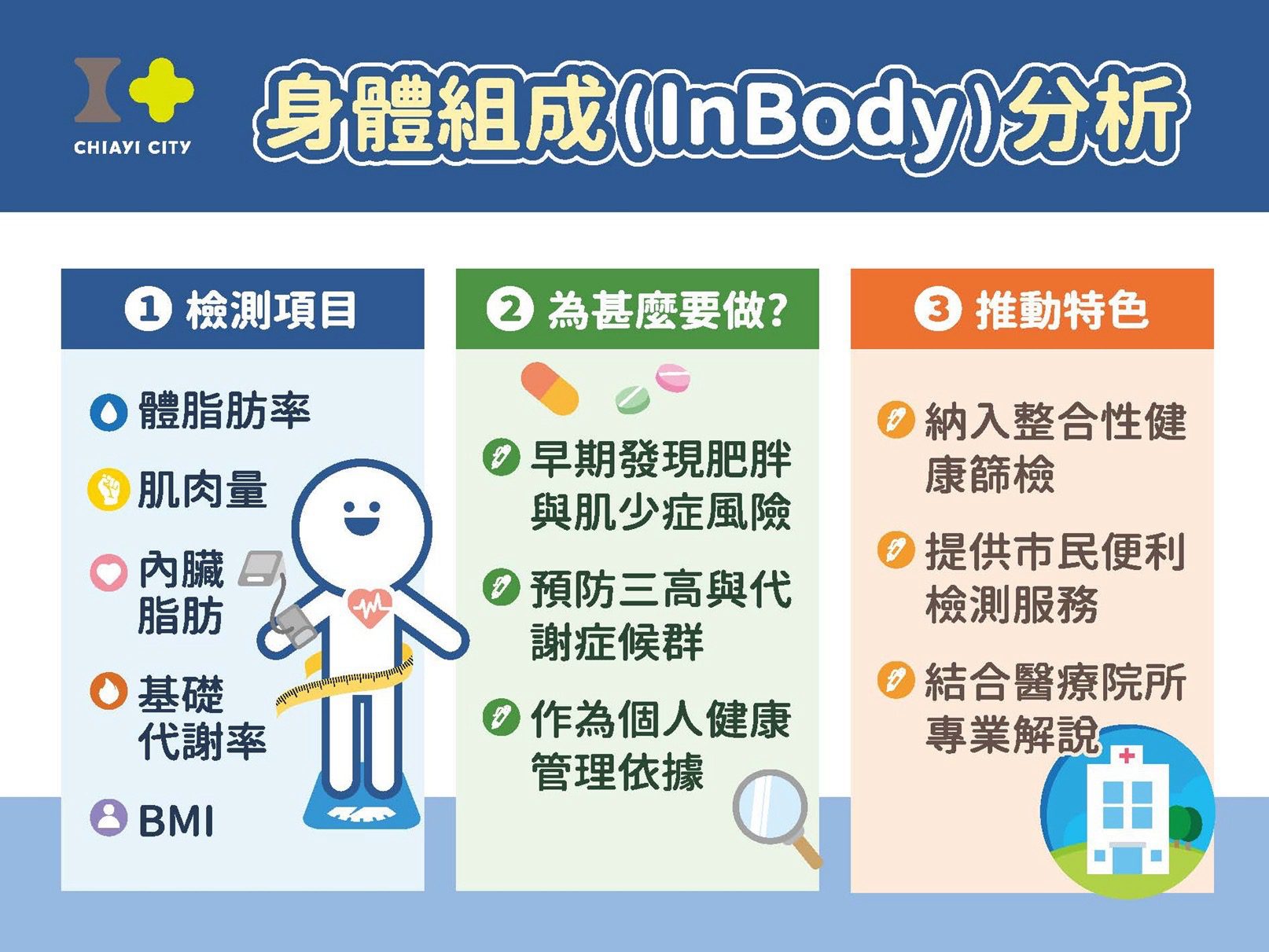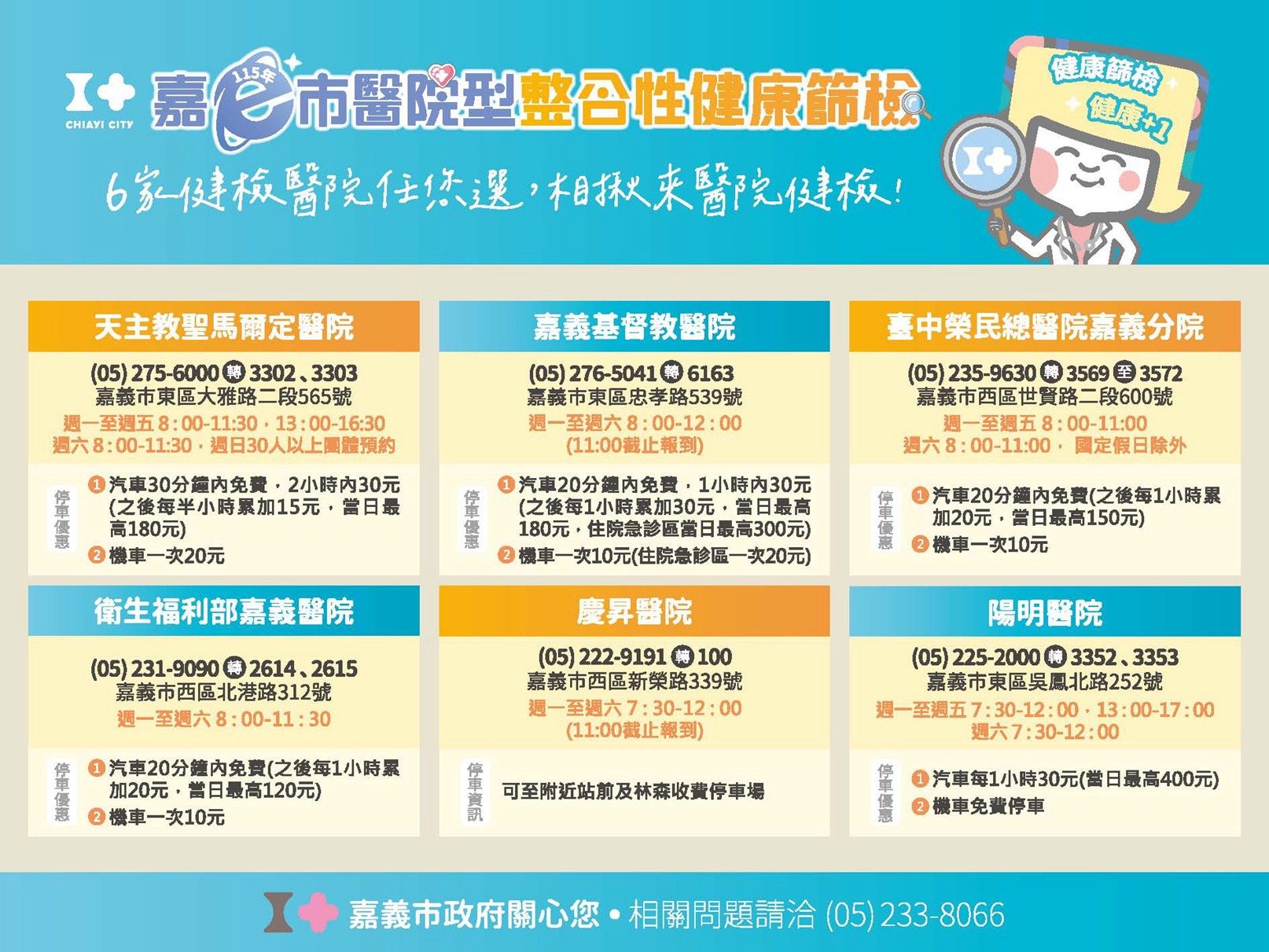 陳永豐表示,嘉義市自96年推動整合性健康篩檢以來,持續整合在地醫療資源,提供市民一站式健康檢查服務,協助早期發現疾病並及早介入治療。今年邁入第20周年,陳永豐副市長特別感謝參與服務的六大優質醫院(聖馬、嘉基、嘉榮、部嘉、慶昇及陽明醫院)及國民運動中心的共同投入,攜手守護市民健康,打造更完善的健康照護網絡。