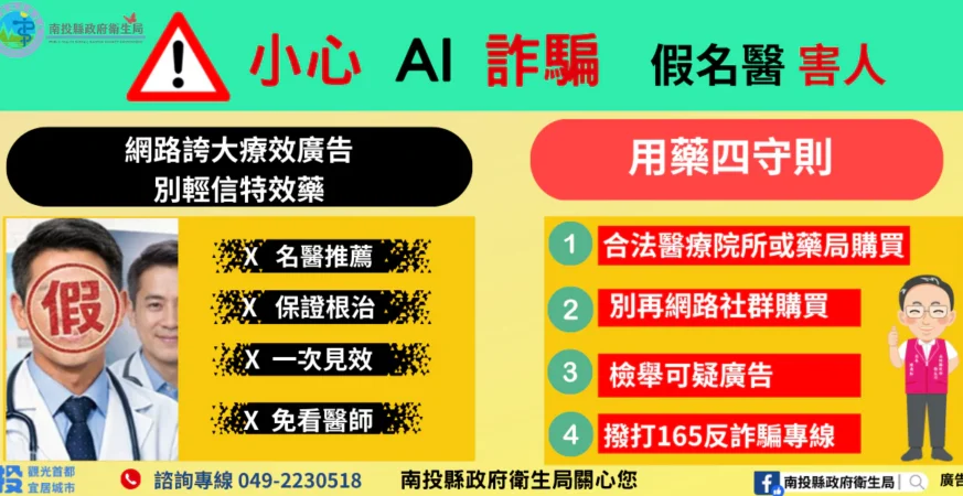 醫藥新聞 AI換臉詐騙入侵醫療廣告! 南投縣衛生局籲民眾 購買藥品務必循合法管道 近日內政部警政署刑事警察局發現,詐騙集團利用AI換臉與高度擬真技術,冒用專業醫師身分,在網路社群平台投放醫療廣 […] news-center 2026 年 3 月 24 日 0 Comments 25 Views