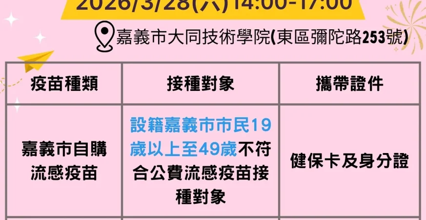 醫藥新聞 看表演、逛市集還能打疫苗 嘉市28日打造青春防疫場域 – 墨新聞 MORE News 初春氣溫多變,呼吸道傳染病傳播風險增加,為提升市民免疫保護力及方便民眾接種疫苗,3月28日(六)下午2時至5時 […] news-center 2026 年 3 月 22 日 0 Comments 37 Views